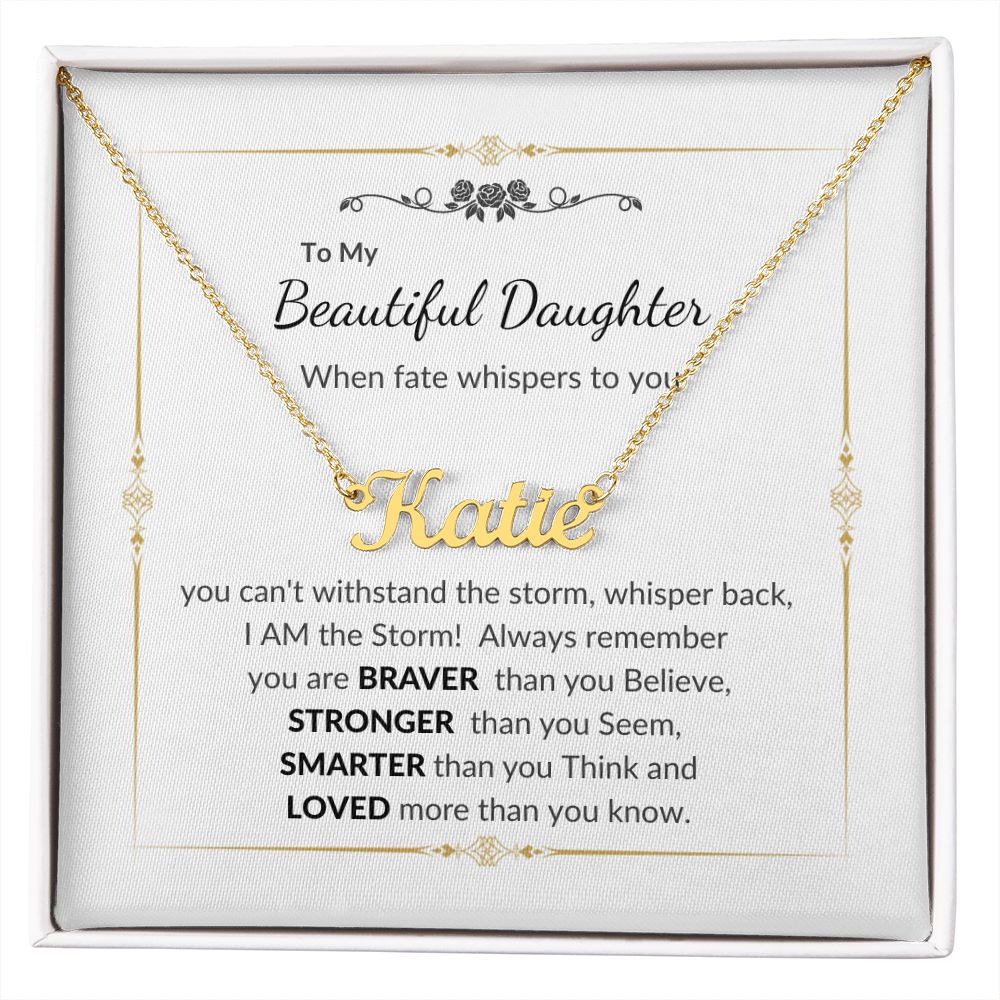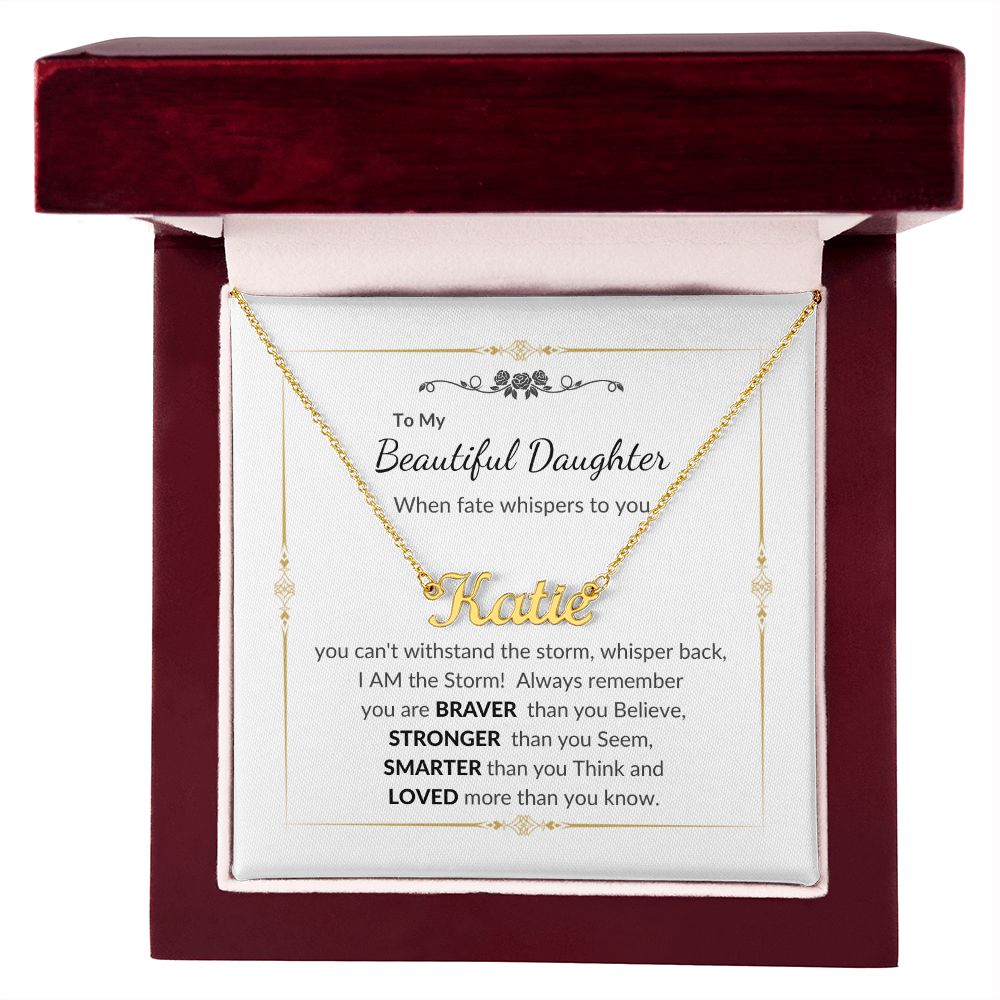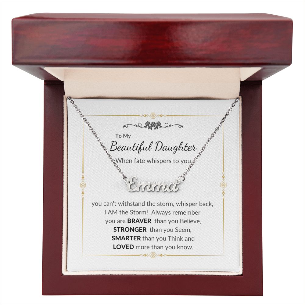 To my Beautiful Daughter When fate whispers to you, you can't withstand the storm; whisper back, I AM the Storm! Always remember you are BRAVER than you Believe, STRONGER than you Seem SMARTER than you Think and LOVED more than you know.