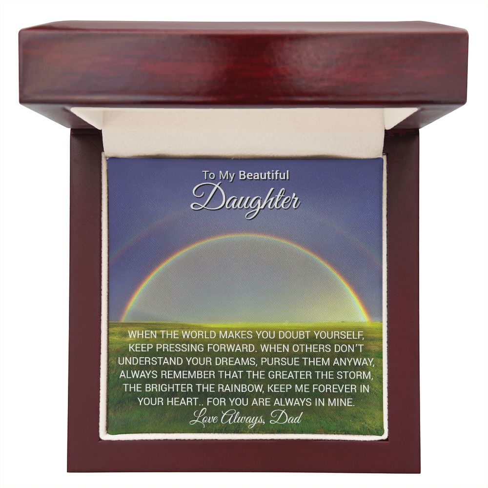 When others don't understand your dreams, pursue them anyway. Always remember that the greater the storm, the brighter the rainbow, keep me forever in your Heart, for you are always in Mine. Love Always, Dad