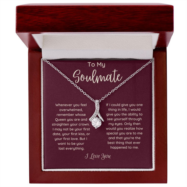 The message card Reads: To my Soulmate Whenever you feel overwhelmed, remember whose Queen you are and straighten your crown. I may not be your first date, your first kiss, or your first love. But I want to be your last everything. If I could give you one thing in life, I would give you the ability to see yourself through my eyes. Only then would you realize how special you are to me and that you're the best thing that ever happened to me. I Love You